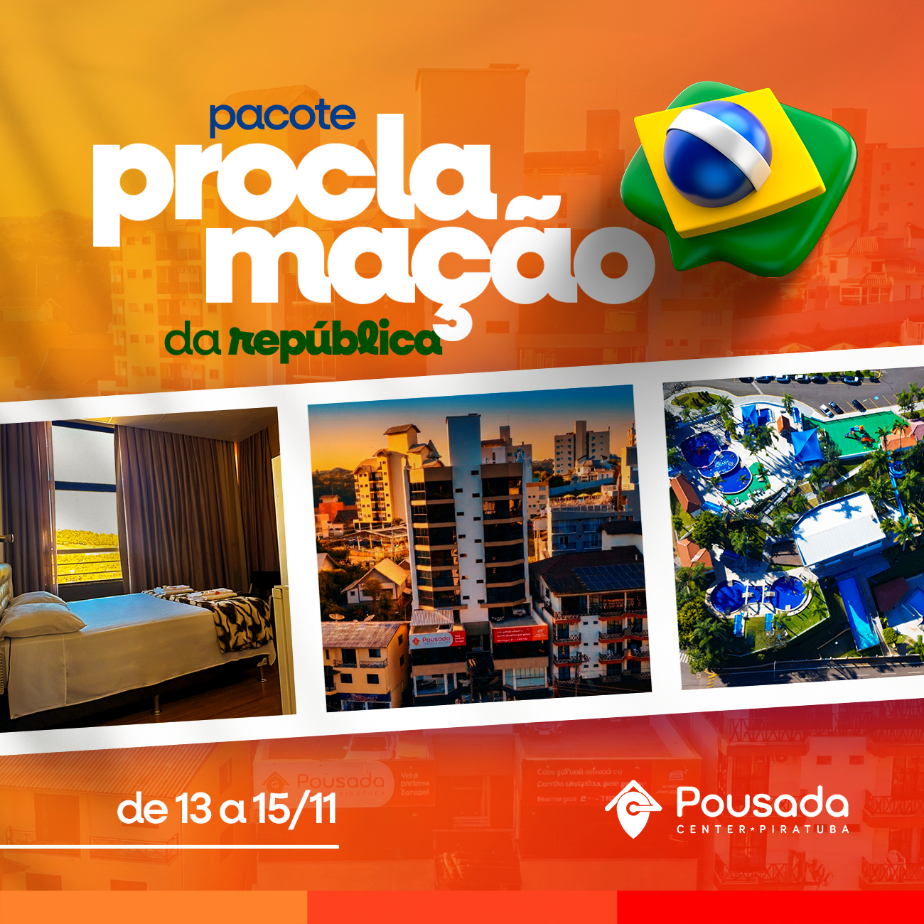 O feriado de 15 de novembro é a oportunidade perfeita para uma escapada estratégica antes das festas de fim de ano. De 13 a 15 de novembro, na Pousada Center (prédio anexo ao Estação Termas Hotel), proclamamos o seu direito ao descanso em uma estrutura que une praticidade, hospitalidade e o melhor custo-benefício de Piratuba.